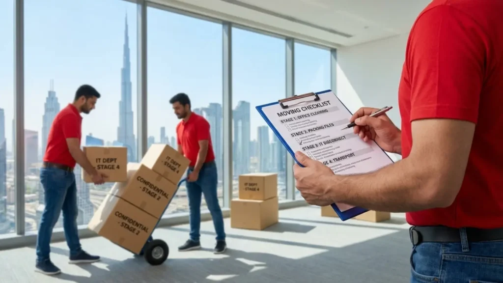 An office relocation checklist for Dubai businesses organizes the entire project into ten sequential stages: inventory and scope, floor plan verification, timeline setup, stakeholder communication, mover selection, building permit applications, IT sequencing, pre move packing, moving day execution, and post move address updates. Each stage depends on the one before it. Miss one and the rest of the project stalls. Complete all ten in the right order and most businesses move over a weekend without losing a single working day.